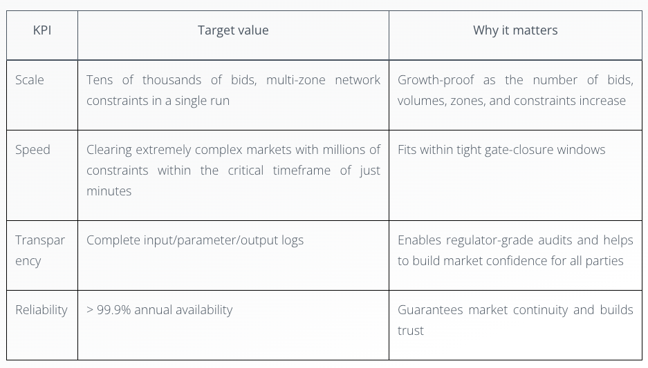- Product-agnostic: A configuration layer maps bid and auction formats (day-ahead, intraday, reserve, capacity) onto one solver core.